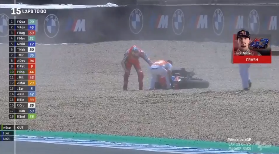 Кругом позже Пекко смог обойти в том же месте Виньялеса, а Миллер наконец-то обошёл M1 в первом повороте. Пилоты Pramac занимали 3 и 4 места, но Миллер выбыл из борьбы, упав за 15 кругов до финиша.