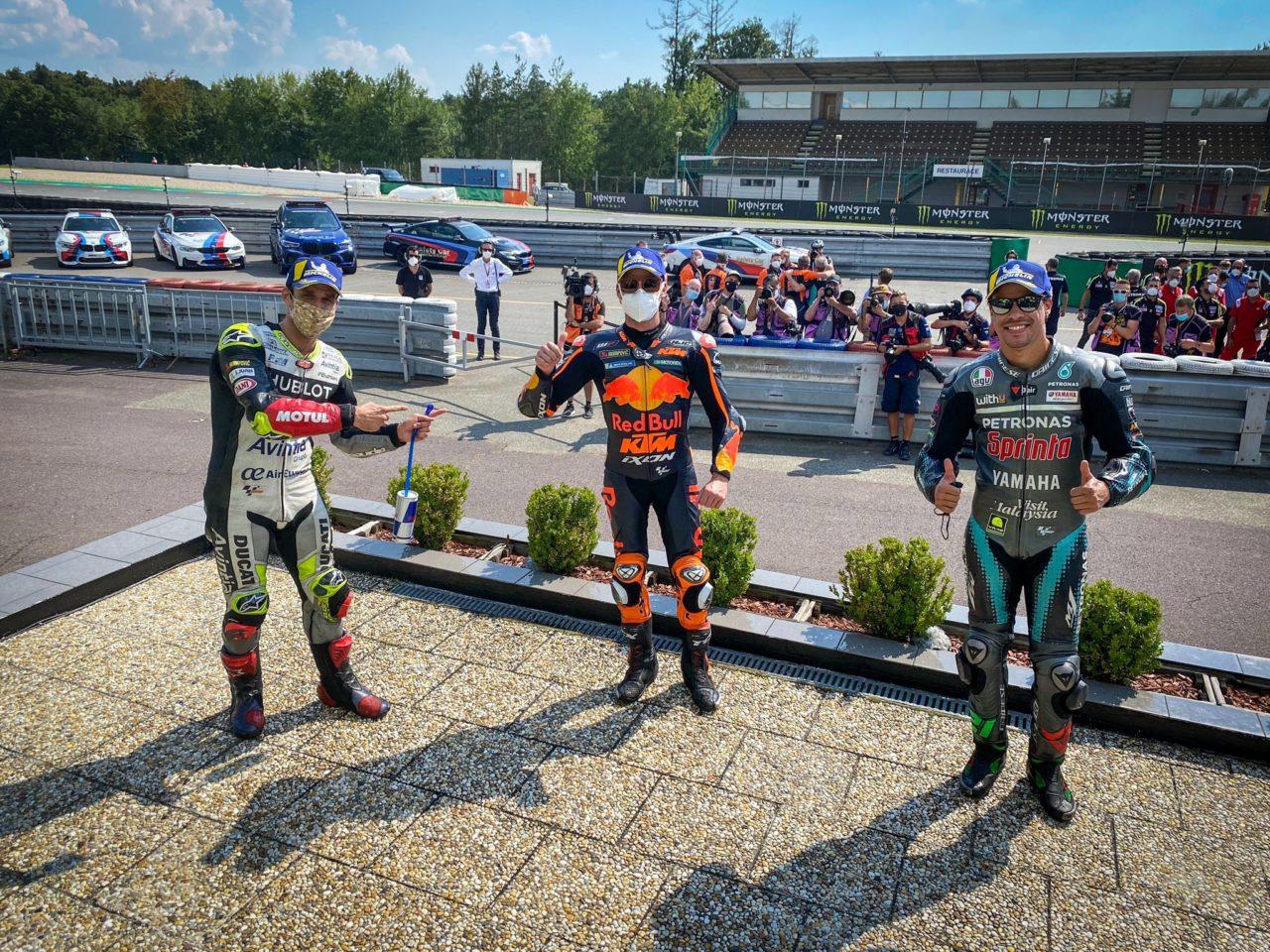 По итогам гонки MotoGP ГП Чехии на подиум забрались Брэд Биндер, Франко Морбиделли и Жоанн Зарко. Ещё менее предсказуемый расклад гонки представить сложно! Биндер проводил лишь третью гонку в карьере MotoGP и добыл KTM первую победу премьер-класса в истории компании. Морбиделли впервые забрался на подиум, проводя третий сезон в MotoGP. На счету Зарко до сегодняшнего дня было 6 подиумов, но француз лишь начал совместный путь с Ducati в текущем сезоне и после слабых первых двух гонок от него никто не ожидал такой прыти. Сезон MotoGP 2020 года продолжает удивлять!