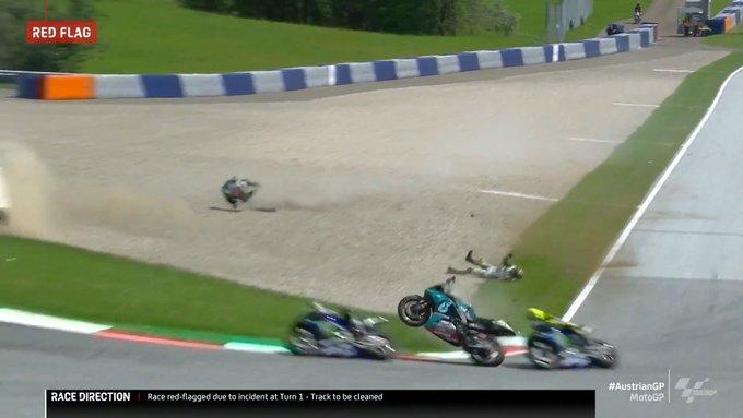 Гонка MotoGP ГП Австрии остановили красными флагами после страшной авария в третьем повороте девятого круга. Перед торможением случалась неразбериха, в результате которой на огромной скорости столкнулись Морбиделли и Зарко. Оба мотоцикла полностью разрушены. К счастью, мотоциклы чудом не прилетели в других гонщиков. Зарко отправился в боксы своими ногами, а Морбиделли сначала положили на носилки. К счастью, чуть позже показали, что итальянец в сознании и может даже самостоятельно держаться на ногах.