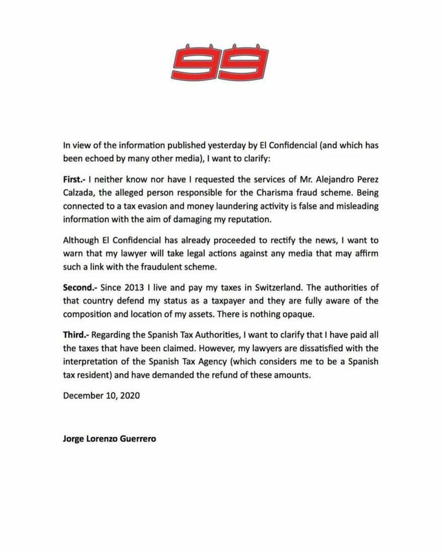 И хотя Хорхе Лоренсо формально покинул мир MotoGP, в новостные заголовки он попадает с завидной частотой. Согласно испанской газете El Confidencial, мадридская налоговая служба начала расследование, подозревая 5-кратного мира в уклонении от налогов. В частности, речь идет об офшорной сети «Red Charisma».