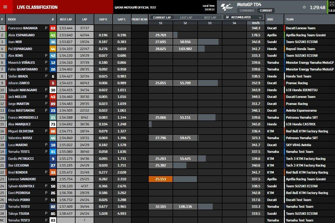Промежуточные результаты четвёртого дня тестов MotoGP 2021 в Катаре (2/3)