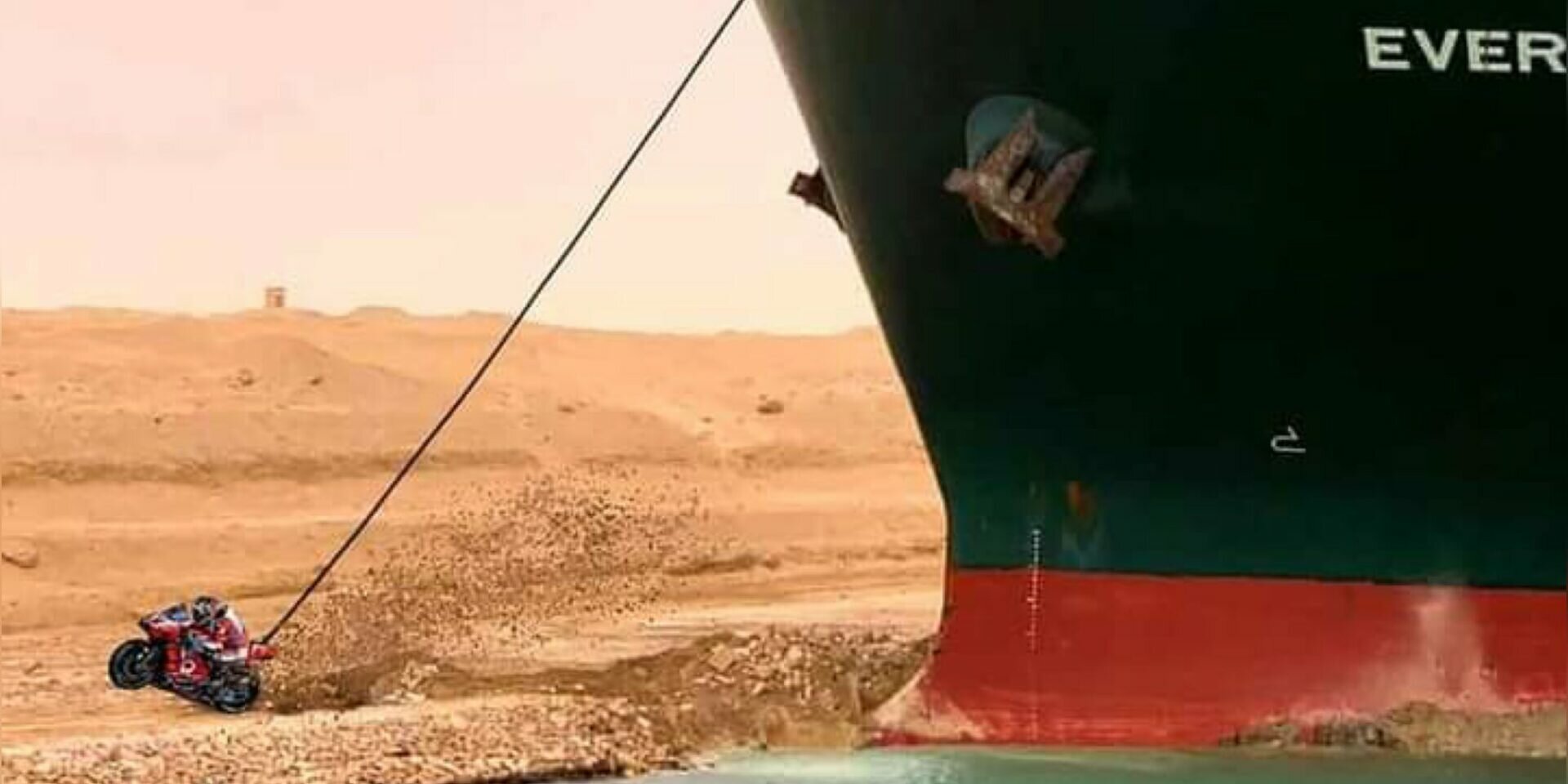 В понедельник к мотоциклу француза привязали гигантский контейнеровоз Ever Given, он дал по газам, и ультамощный итальянский V4 вытащил махину из плена. Судно, которое почти неделю стояло поперек канала и шла из Китая в Нидерланды, 400 м в длину и берет на борт контейнеров почти на 224 тысячи тонн! Стоимость добра на Ever Given превышает 10 миллиардов долларов.