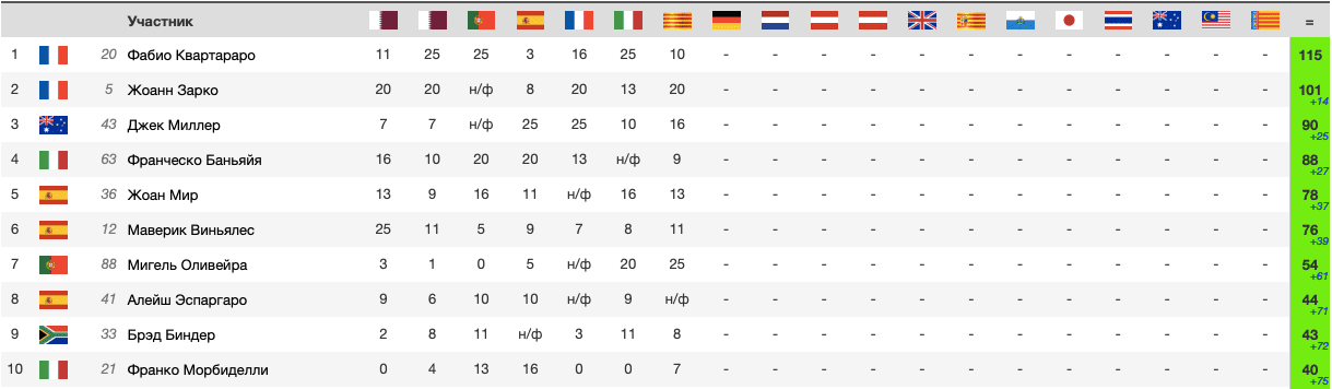 Топ-10 гонщиков после 5/24 кр.: Оли, Мил, Мир, Ква, АЭсп, ММар, Зар, Вин, Бин, Бан