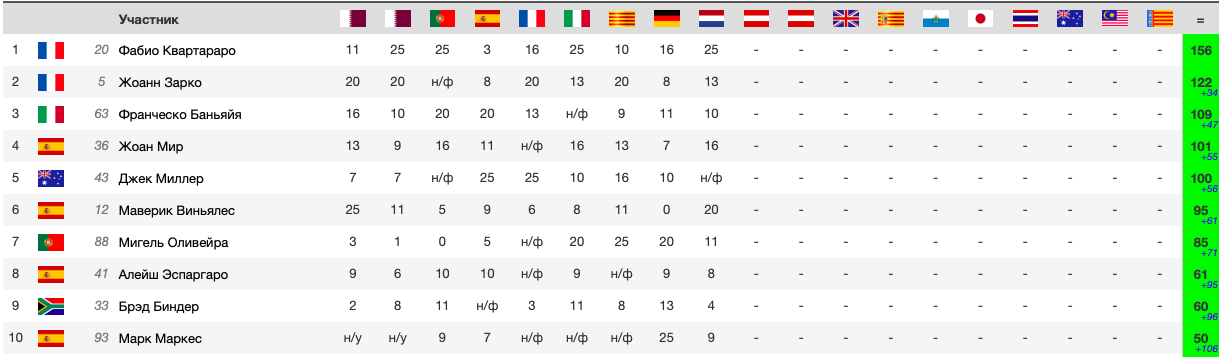 Топ-10 гонщиков после 18/26 кр.: Ква, Вин, Зар, Мир, Оли, Бан, АЭсп, ММар, Нак, ПЭсп
