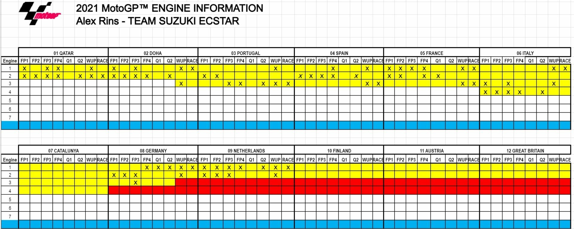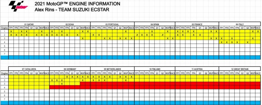 Только у четырёх гонщиков — Алекс Ринс (Suzuki), Лука Марини (Ducati), Марк Маркес (Honda) и Франко Морбиделли (Yamaha) — есть списанные двигатели спустя полсезона. Это означает, что двигатель невозможно будет использовать на протяжении сезона. Ринс выделился, так как он единственный гонщик, который «потерял» на данный момент два двигателя.
