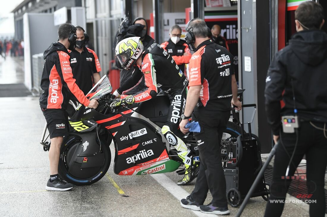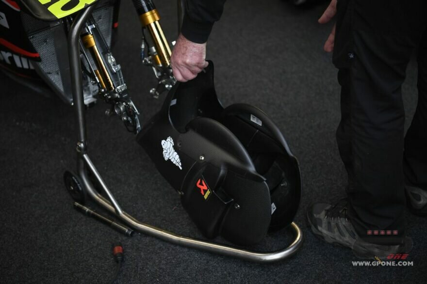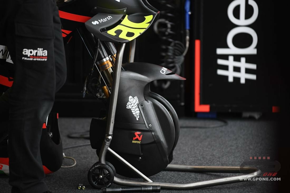 Покрышки и аэродинамика — две основные области, над которыми трудятся инженеры MotoGP. Зачастую разработки в данных областях ведутся параллельно. И это как раз случай Aprilia, которая в Мизано начала использовать наработку, цель которой, во-первых, улучшить аэродинамику, а во-вторых, повысить температуру тормозной системы и покрышек. То что надо для первого дня ГП Эмилии-Романьи, который прошёл в мокрых прохладных условиях.