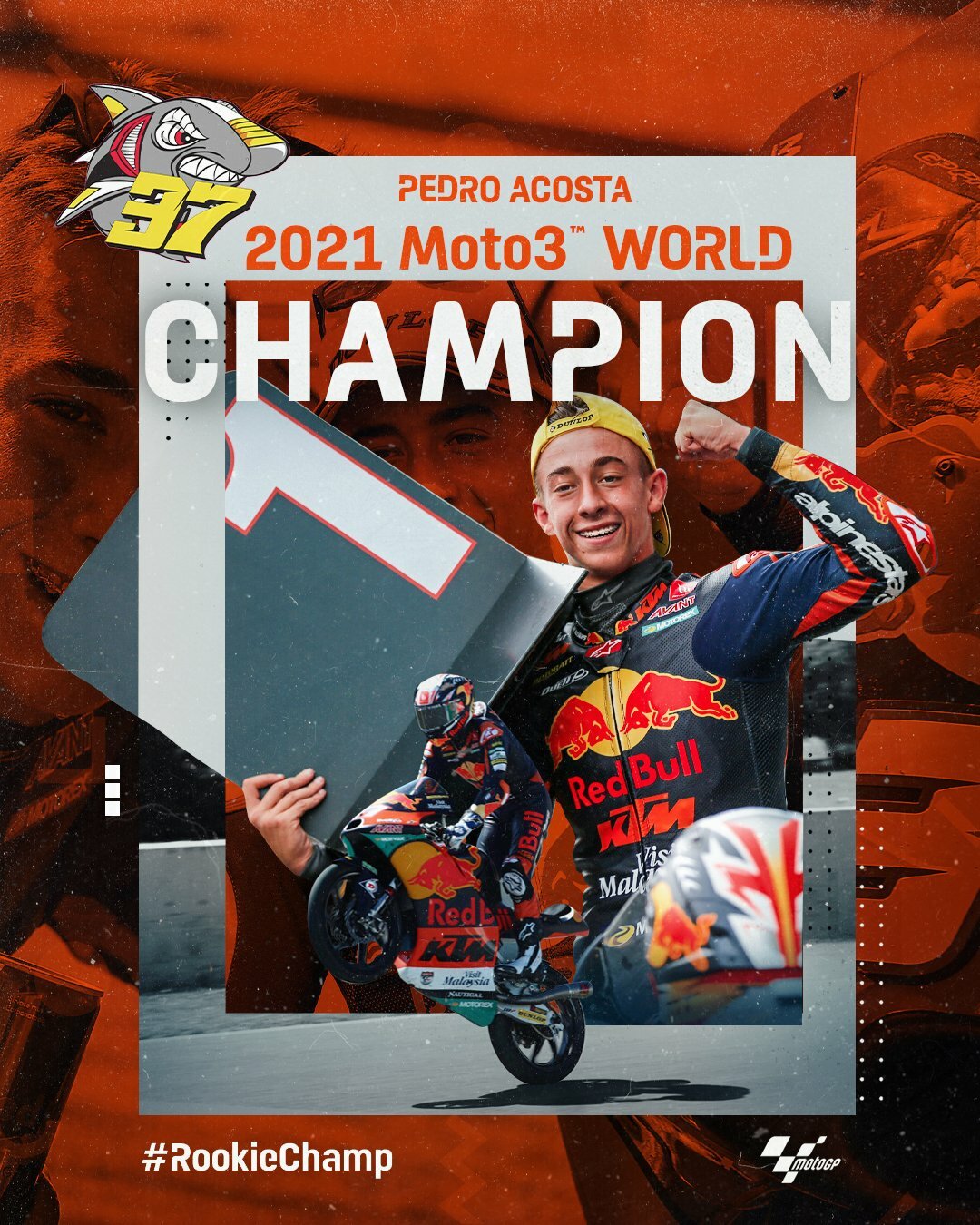Arrive, win the title, leave!!! 💪@37_pedroacosta takes the #Moto3 title in his debut season!!! 🥇#RookieChamp 🦈 | #AlgarveGP 🏁 pic.twitter.com/MBu2gvYxuB