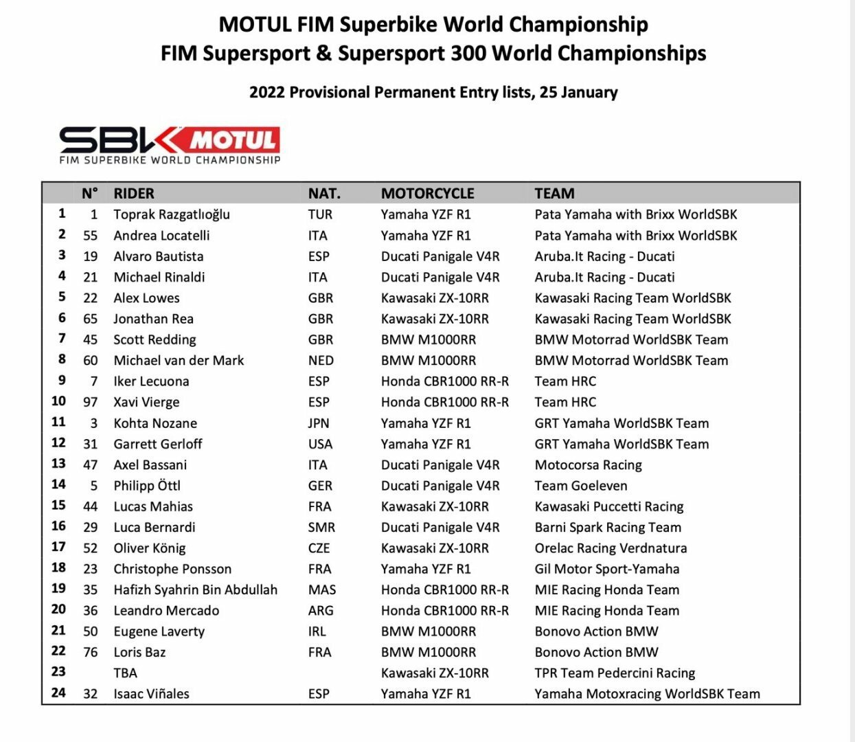 После завоевания титула чемпиона мира WorldSBK 2021 Топрак Разгатлиоглу убеждал нас в том, что сохранит верность своему №54, однако сейчас вышел официальный список участников Супербайка на сезон-2022, и, судя по всему, турок решился взять себе чемпионскую единичку. А свергнутый Джонатан Рей возвращается к №65.