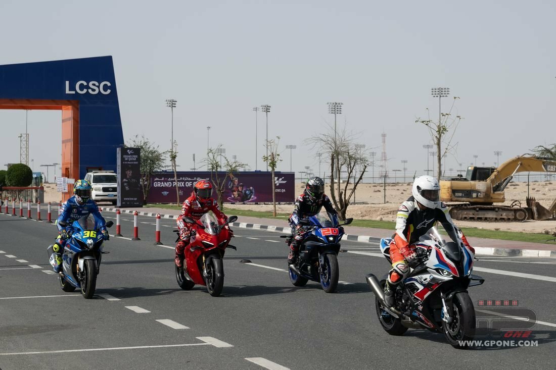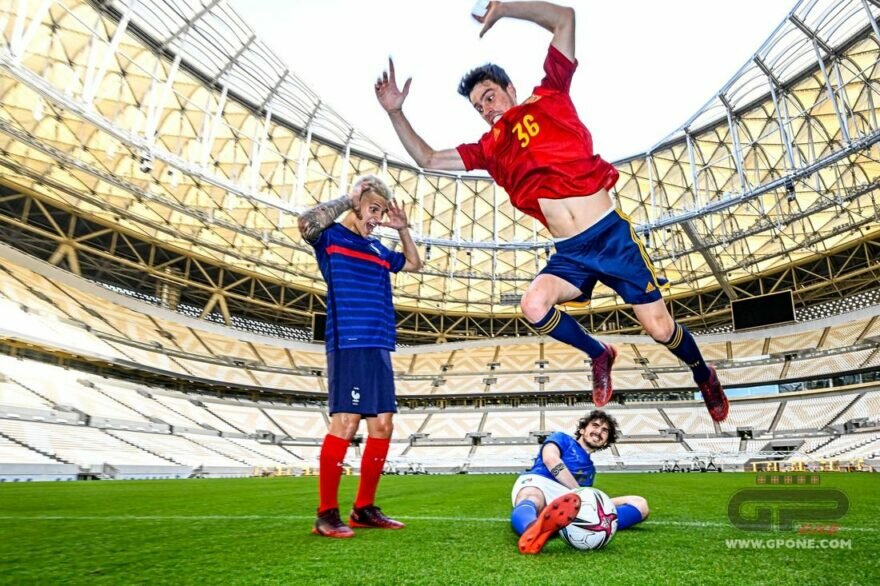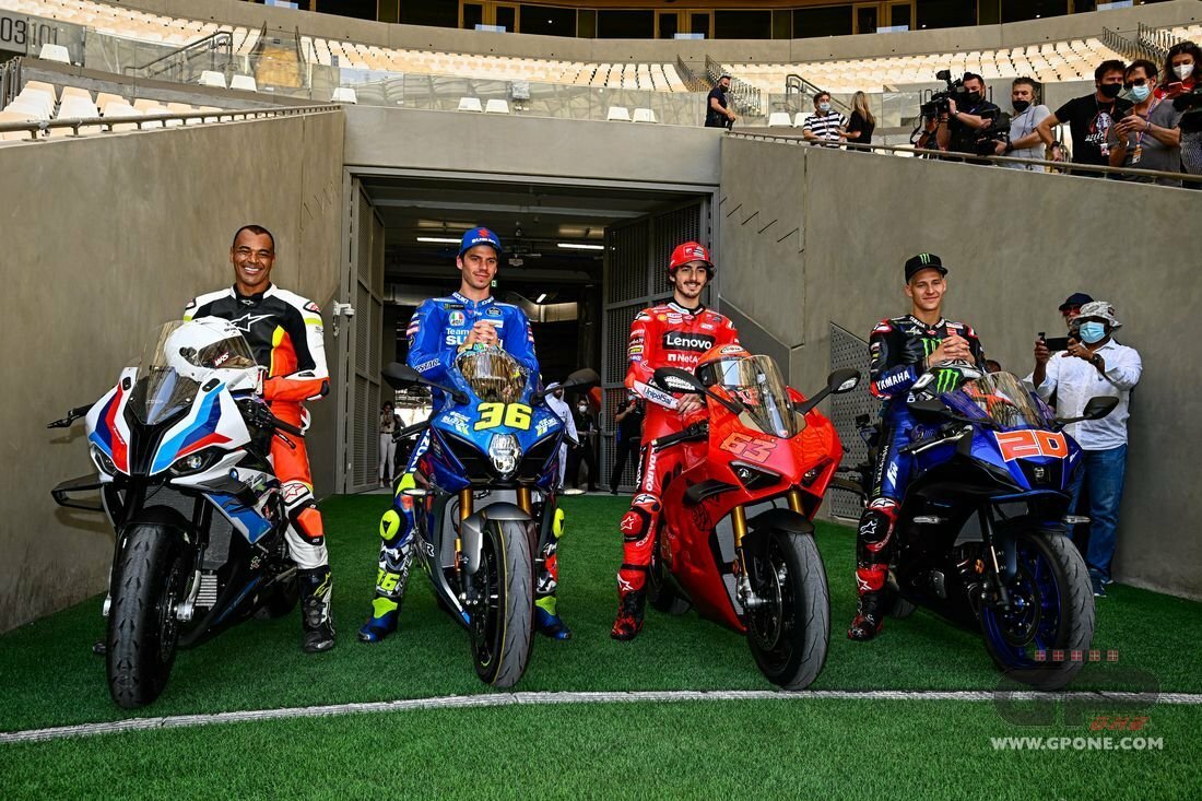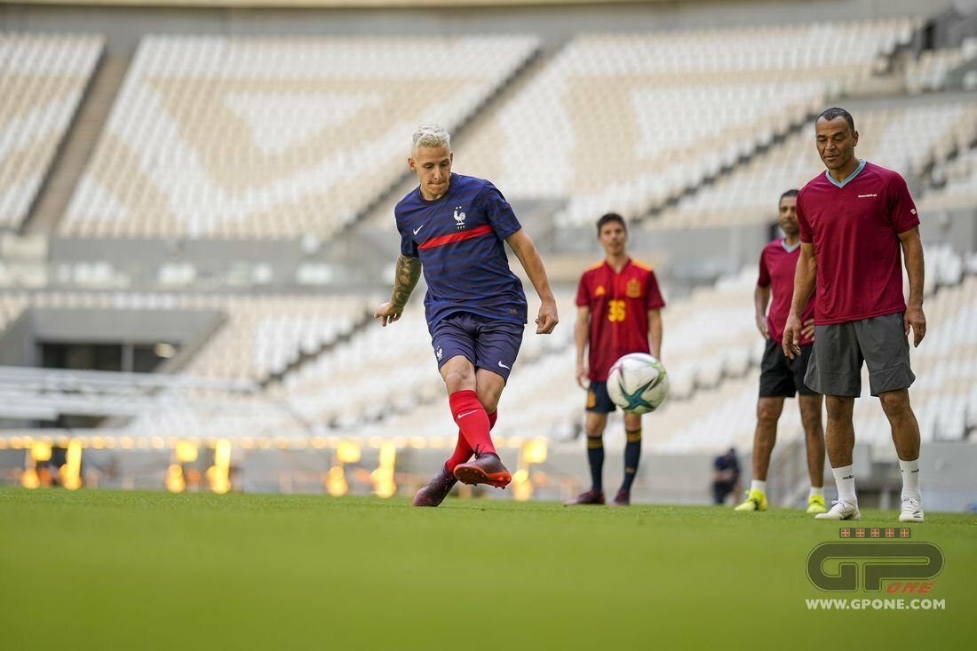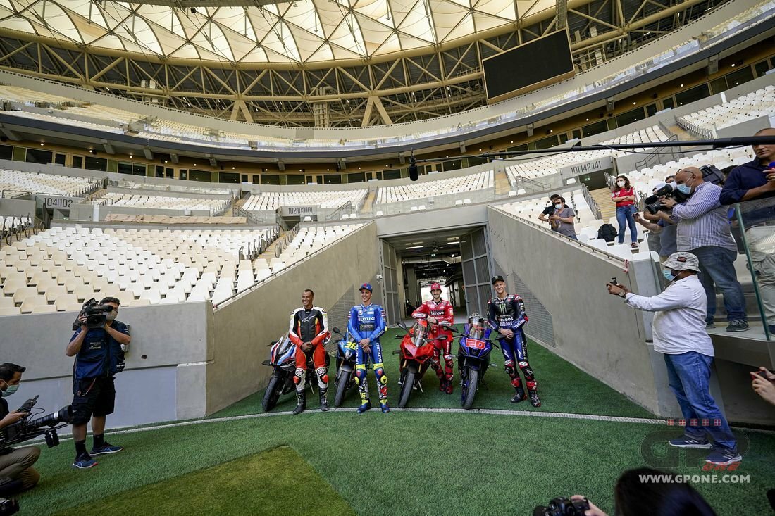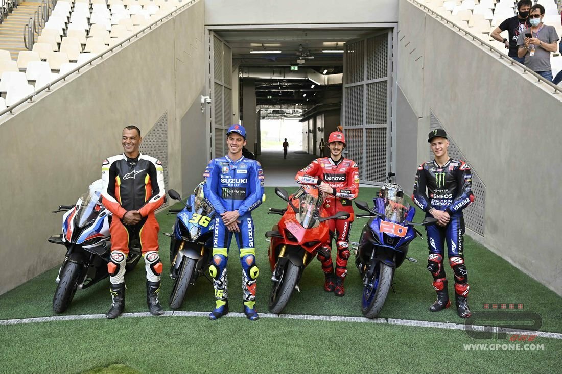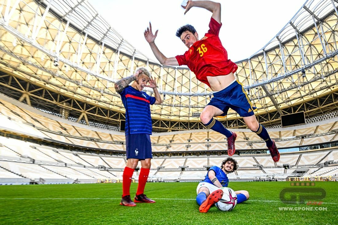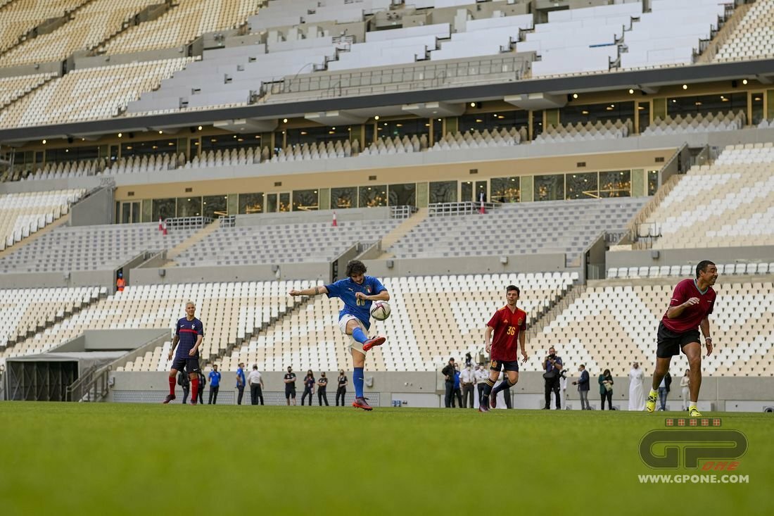 В этом году Катар примет чемпионат мира по футболу, и гонщики MotoGP не смогли устоять от предложения повеселиться на одном из стадионов, где будут проходить матчи. Баньяйя, Квартараро и Мир надели свой комбинезоны, натянули на голову шлем и отправились на своих железных конях на стадион Lusail Iconic Stadium. Сопровождал их специальный гость – бразильский футболист Кафу. Он тоже проехал на мотоцикле – BMW M 1000 RR.