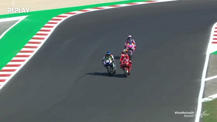Алекс Маркес (LCR Honda) и его будущий напарник по команде Эния Бастианини находились непосредственно за пилот Ducati Lenovo Team и упёрлись в него.