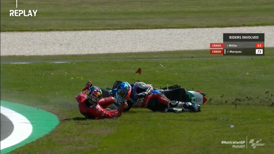 Потеряв контроль над своей Honda, Алекс Маркес выбил Джек Миллера на 9 круге гонки MotoGP ГП Австралии. За этот опасный инцидент испанца наказали штрафом «длинного круга» в следующей гонке в Малайзии. Испанец признаёт вину и извиняется перед Джеком.
