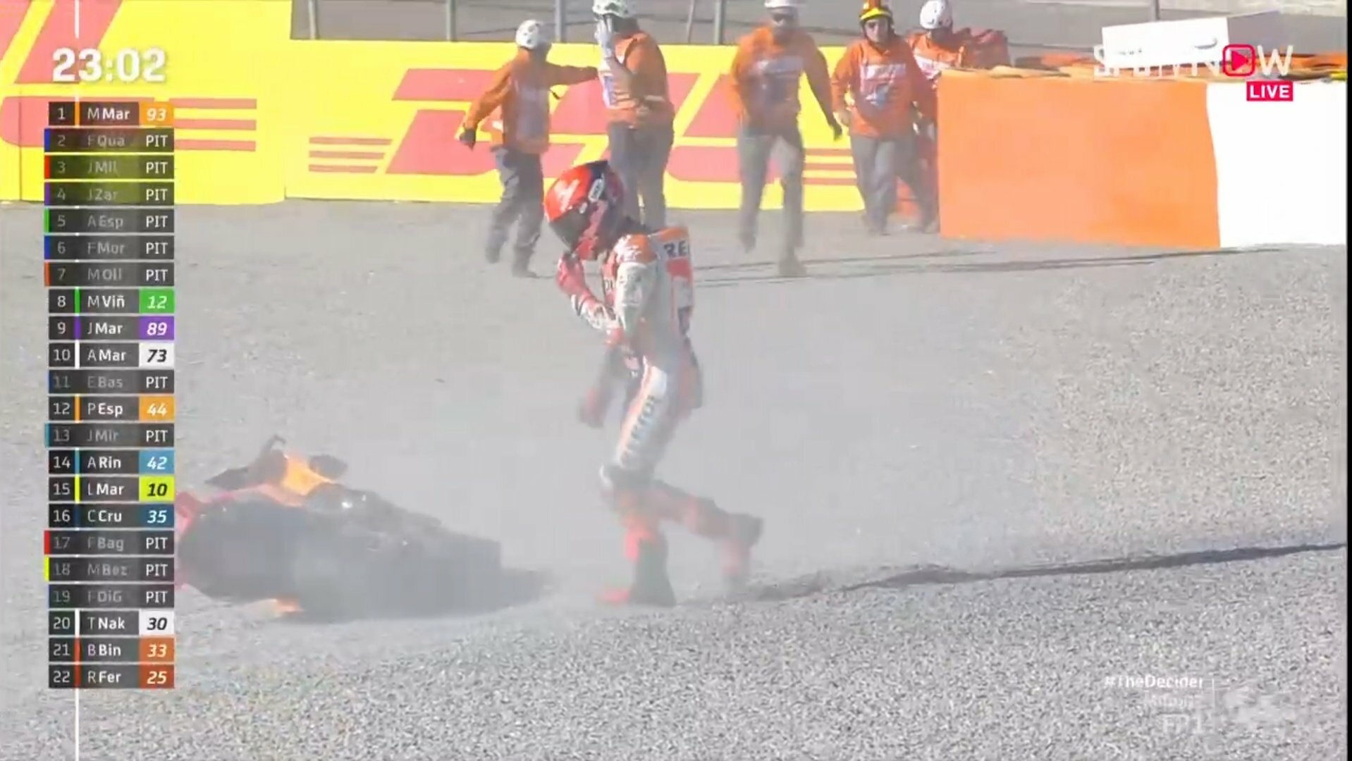 Марк Маркес был определённо быстр в первый день ГП Испании. Пилот Repsol Honda решил выложится по полной на последнем этапе MotoGP 2022 года, и это позитивно сказалось на скорости, но негативно на статистике падений – испанец дважды оказывался в гравии.