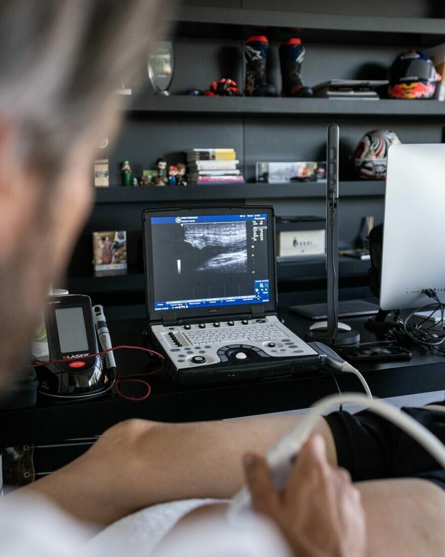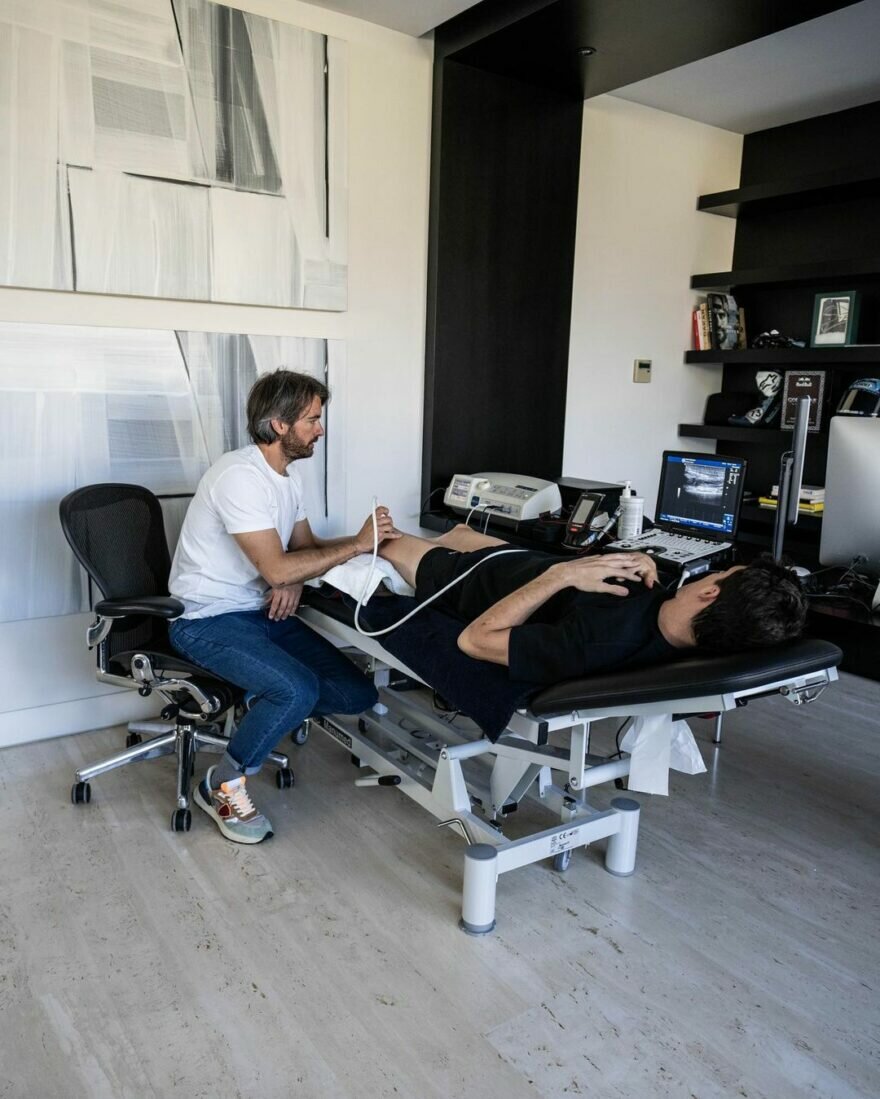 С помощью УЗИ мы увидели, что после удара в воскресенье произошел разрыв латеральной широкой мышцы четырёхглавой мышцы и растяжение связки.