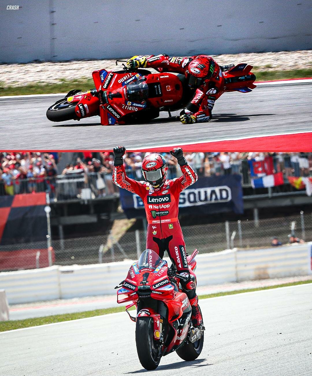 Франческо Баньяйя «сгладил» очередную разочаровывающую спринтерскую гонку победу в воскресном заезде Гран-При Каталонии. После досадного падения с первого места на последнем круге спринт-гонки Пекко собрался и блестяще провёл главную гонку уик-энда. Заводской пилот Ducati обогнал своего главного соперника в борьбе за титул Хорхе Мартина за шесть кругов до финиша и уверенно удерживал лидерство до финишной черты с комфортным отрывом.