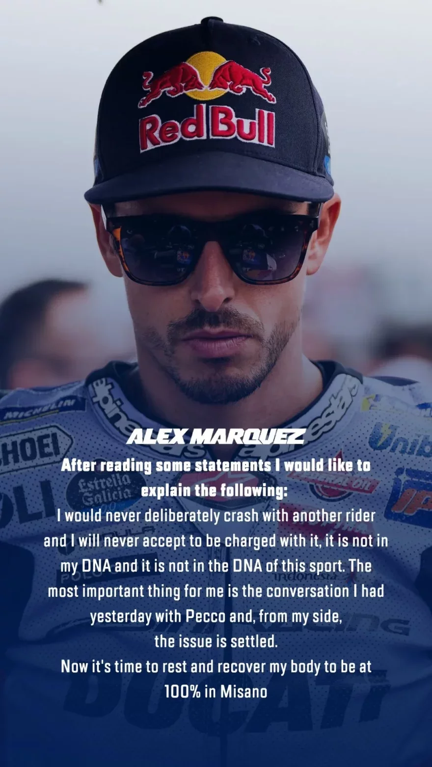 Я никогда не буду сознательно сталкиваться с другим гонщиком, и я никогда не приму обвинение в этом. Это не в моей ДНК и не в ДНК этого спорта. Для меня самым важным является разговор, который я вчера провел с Пекко, и, с моей стороны, вопрос исчерпан.